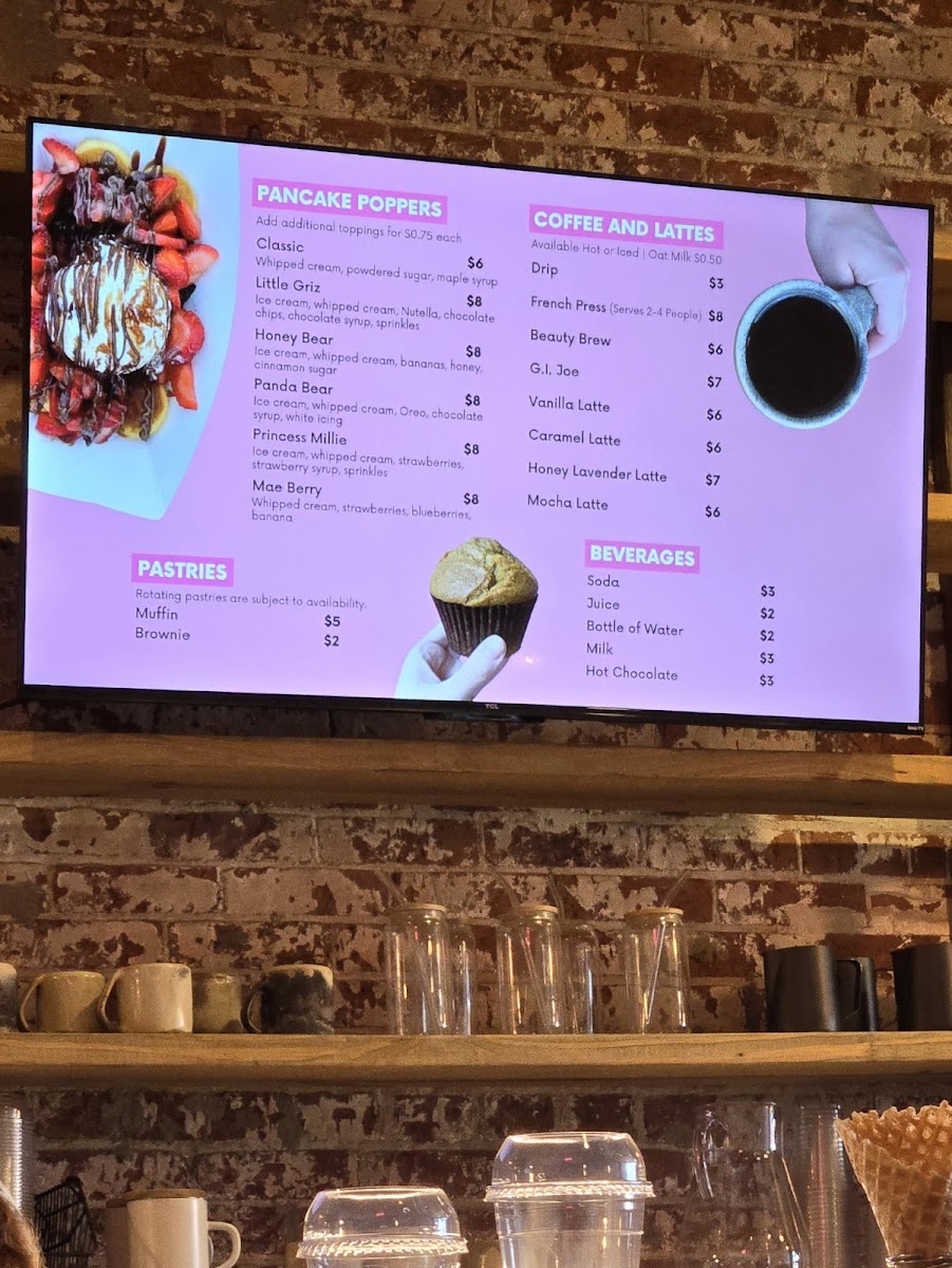 Pancake poppers topped with fresh cut strawberries, bananas and blueberries . Covered in a drizzle maple syrup and powered sugar. Served with a hefty side of whipped cream.