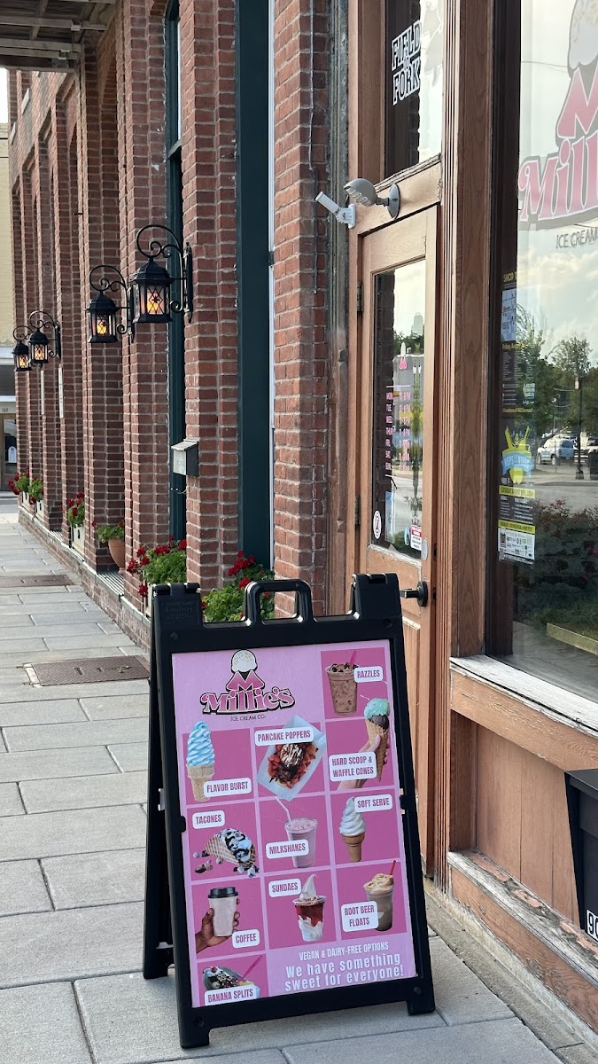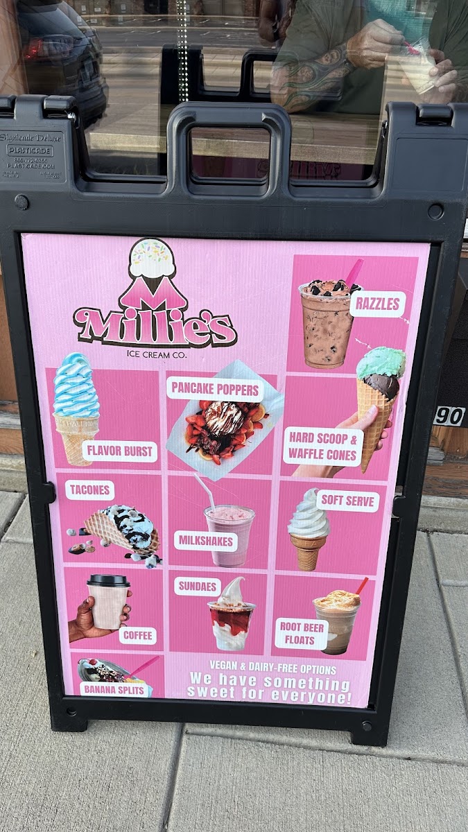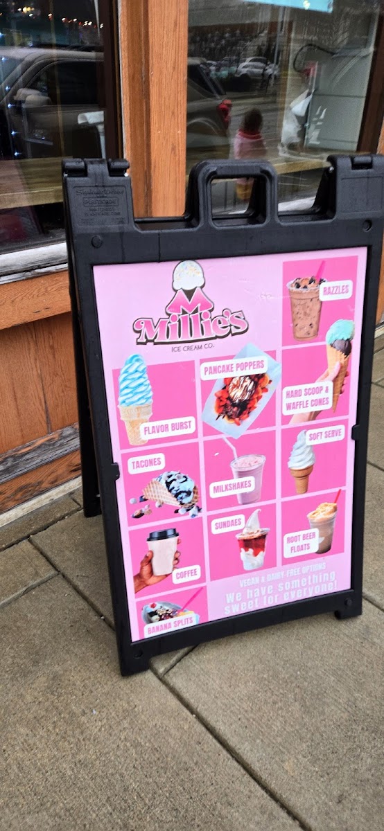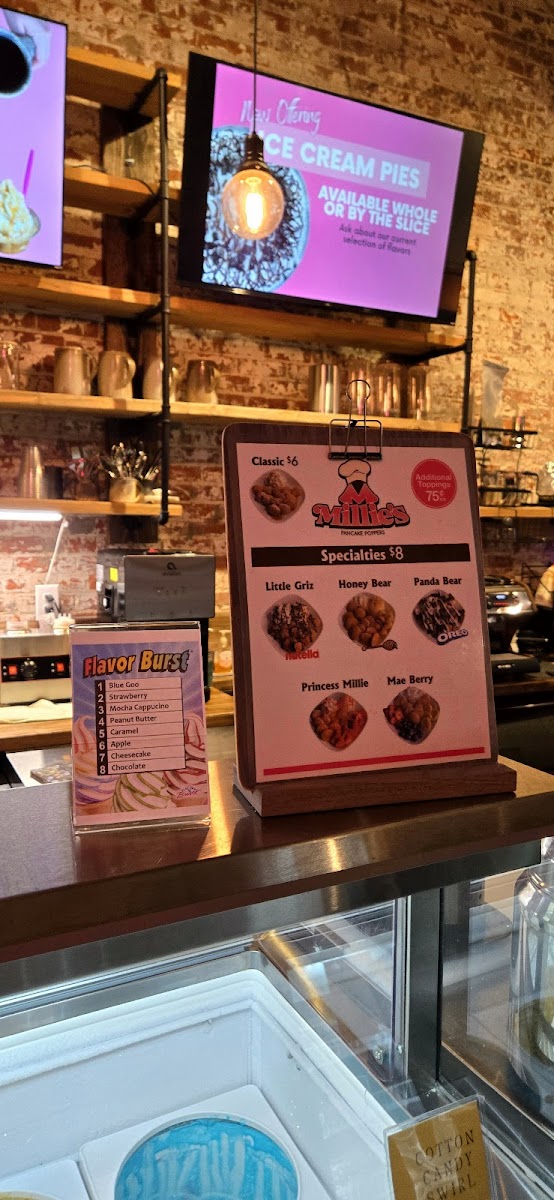 The menu at Millie's Ice Cream Co. offers a delightful mix of sweet treats and refreshing beverages perfect for any occasion. Among their top offerings is the Razzle, a fun, customizable dessert. For those craving something a bit more indulgent, the Chocolate Chunk Fudge Brownie and Chocolate Chip Cookie are perfect choices, alongside rotating weekly Muffins. Their Dippin' Dots collection features classic favorites like Cookie Dough, Cotton Candy, Cookie Monster, and Cookies and Cream, along with a Dairy Free ICEE for those with dietary restrictions. For a dessert experience with a twist, try an Ice Cream Pie, available in both slice and whole pie formats. Millie's also serves a variety of classic drinks, including a refreshing Root Beer Float, Soda Floats, and Hot Chocolate. For coffee lovers, there’s an array of rich lattes such as the Honey Lavender Latte, Mocha Latte, and seasonal Caramel Latte and Toffee Crunch Latte. The ice cream section includes fun choices like the Banana Split, Millie Bar, and Scoop of Ice Cream (available in 1 scoop), along with Flavorburst Soft Serve. The Sundaes menu is packed with mouthwatering options, including the Strawberry Cheesecake Sundae, Hot Fudge Sundae, Turtle Sundae, and the decadent Hot Fudge Brownie Sundae. For something savory, try the Love Boat Nachos. Their Pancake Poppers, with flavors like Mae Berry, Classic, and Panda Bear, make a fun addition to the menu. Finally, no visit is complete without a creamy Milkshake. Whether you’re looking for something to sip on or a sweet treat to enjoy, Millie’s has it all.